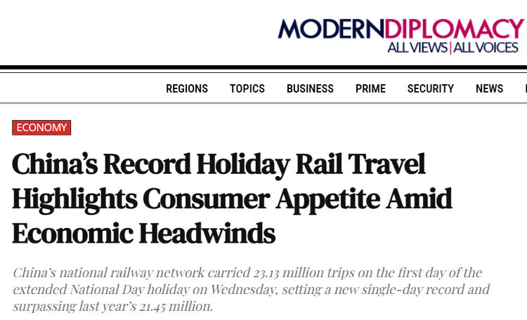 “史上最忙假期”:旅程激增反映出消费者信心不断上升。欧洲《现代外交》报道称,中国国庆、中秋“超长黄金周”首日,中国铁路发送旅客2313万人次,创下单日最高纪录。报道援引官方预测称,整个八天假期的出行总人次预计将达到23.6亿人次,平均每天出行人次近3亿人次,成为“史上最繁忙的假期”。
